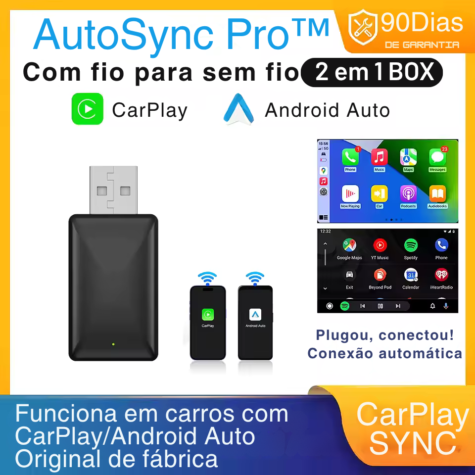O AutoSync Pro conta com uma tecnologia totalmente inovadora: além de permitir o uso do CarPlay e Android Auto sem fio, ele oferece conexão rápida, estável e segura. Sua compatibilidade universal garante praticidade no dia a dia, transformando qualquer central multimídia em uma experiência moderna, fluida e sem complicações.